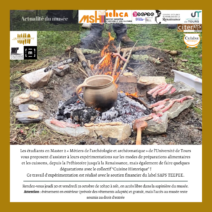 Les étudiants en Master 2 "Métiers de l'archéologie et archéomatique" de l'université de Tours proposent au grand public d'assister à leurs expérimentations sur les modes de préparations alimentaires et les cuissons, depuis la Préhistoire jusqu'à la Renaissance.